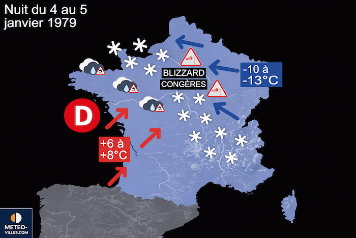 Dans la soirée du 3 janvier 1979, tandis que le froid intense recouvre encore une grande partie du territoire, une perturbation atlantique atteint les régions de l’Ouest. Dès son arrivée sur la façade atlantique, la neige tombe, mais la perturbation se heurte à l’air glacial qui résiste plus au nord et à l’est.