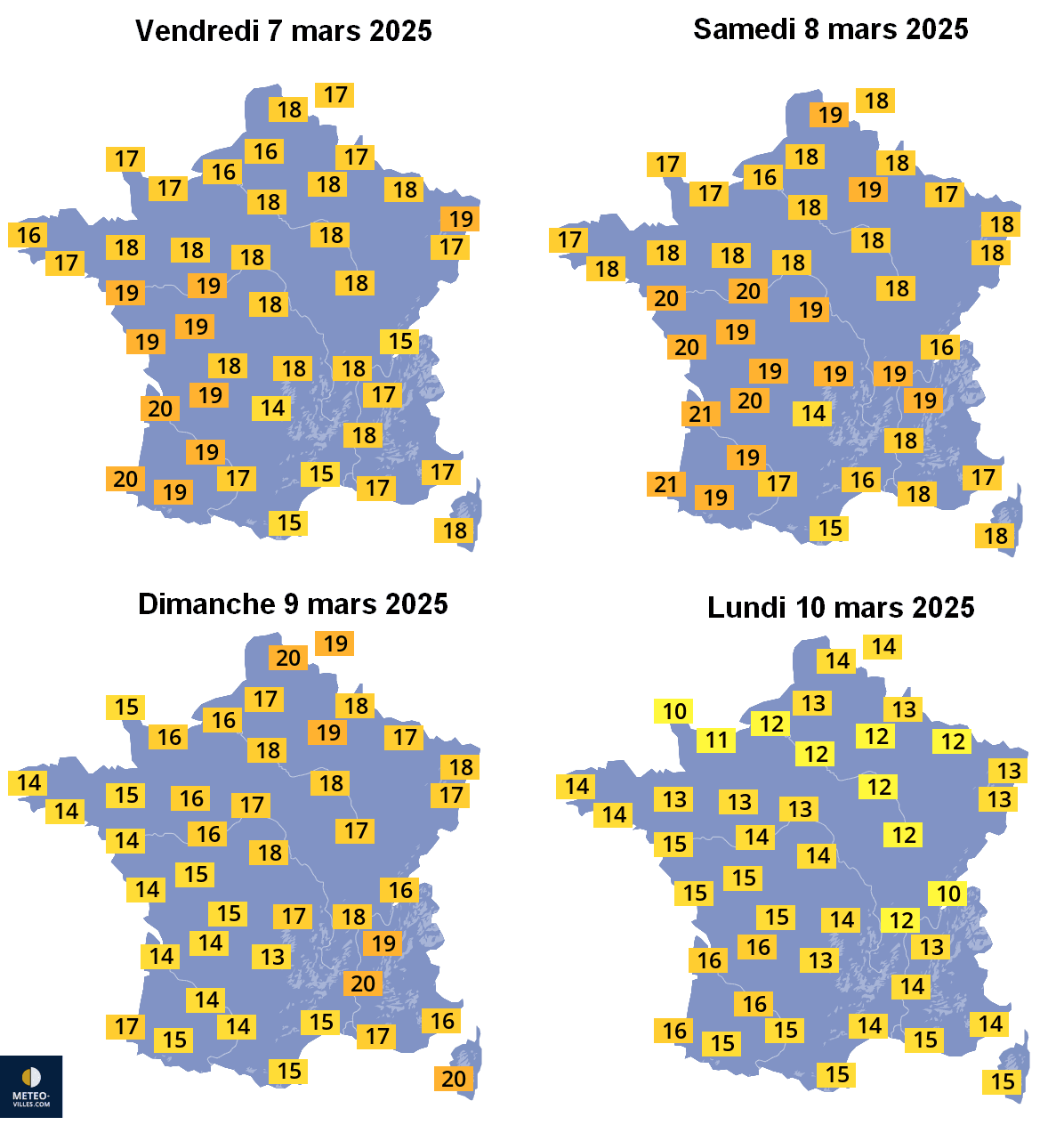 Évolution des températures maximales sur la France du 7 au 10 mars 2025 – Météo-Villes