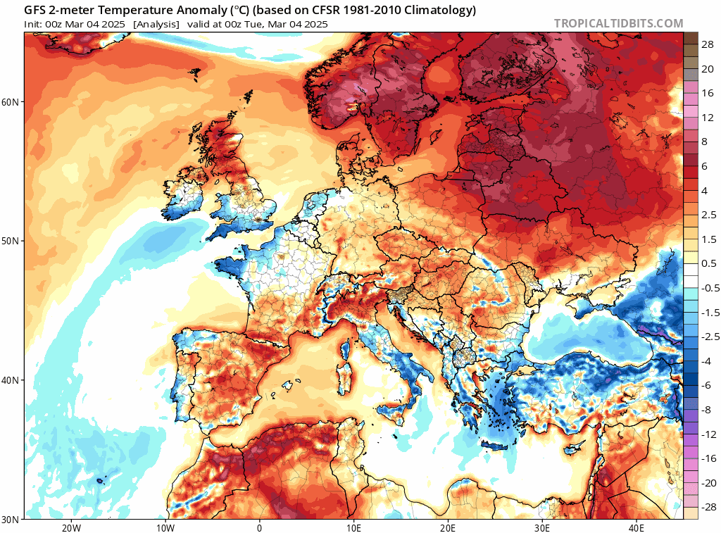Anomalies de températures sur l'Europe du 5 au 9 mars 2025 – via TropicalTidBits