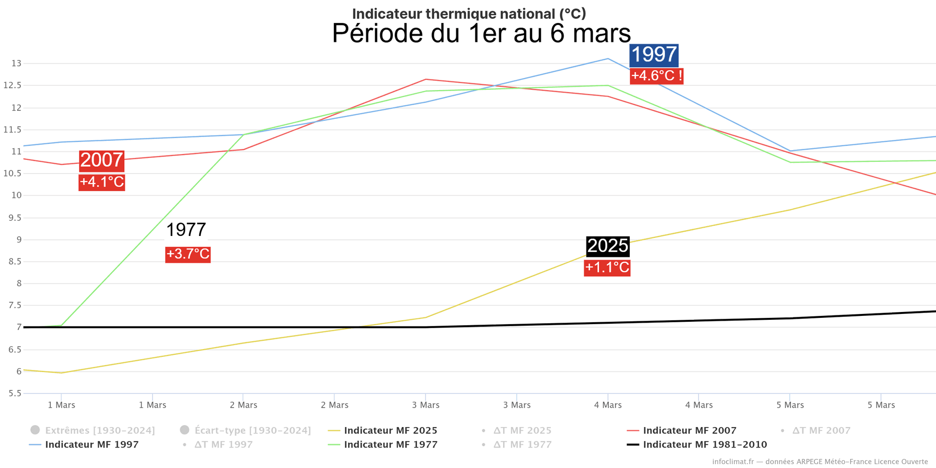 Comparaison de l'évolution de l'indicateur thermique national du 1er au 6 mars en 2025, 2007, 1997 et 1977 – Via infoclimat.fr