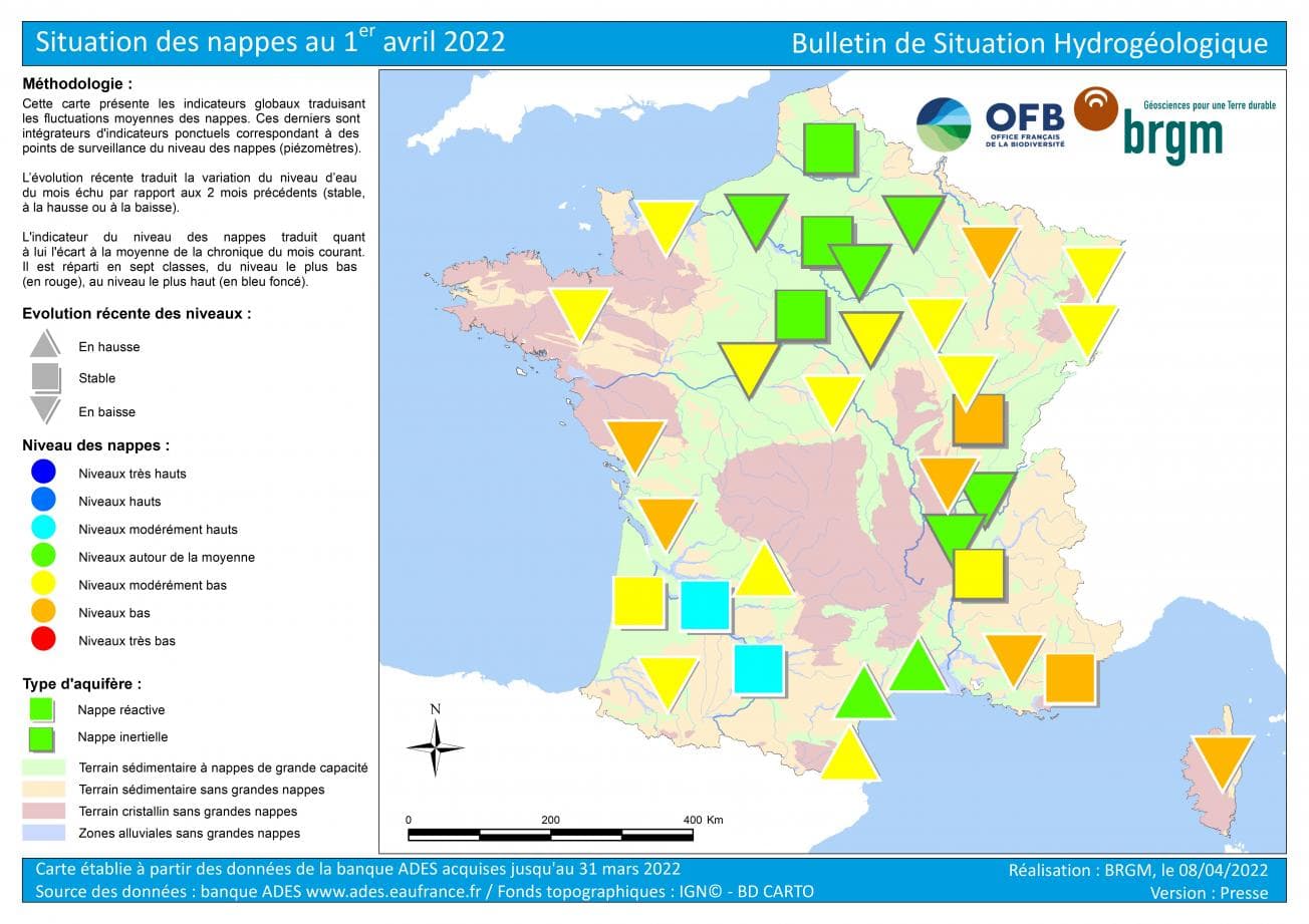 Du côté des ressources en eau souterraines, les nappes phréatiques affichent des niveaux très hétérogènes au 1er avril 2022 sur la France. On constate que les niveaux sont bas et encore régulièrement en baisse entre l'Est et l'Ouest du pays, autour de la moyenne sur le Nord et le Languedoc et modérément hauts sur le Sud-Ouest.