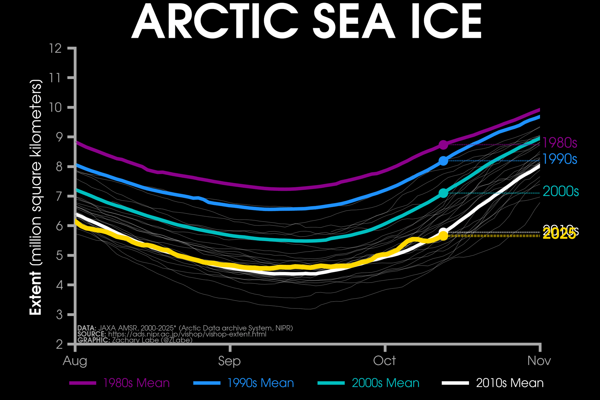 Superficie de la banquise en millions de kilomètres carrés (2025 en jaune) - via zacklabe.com