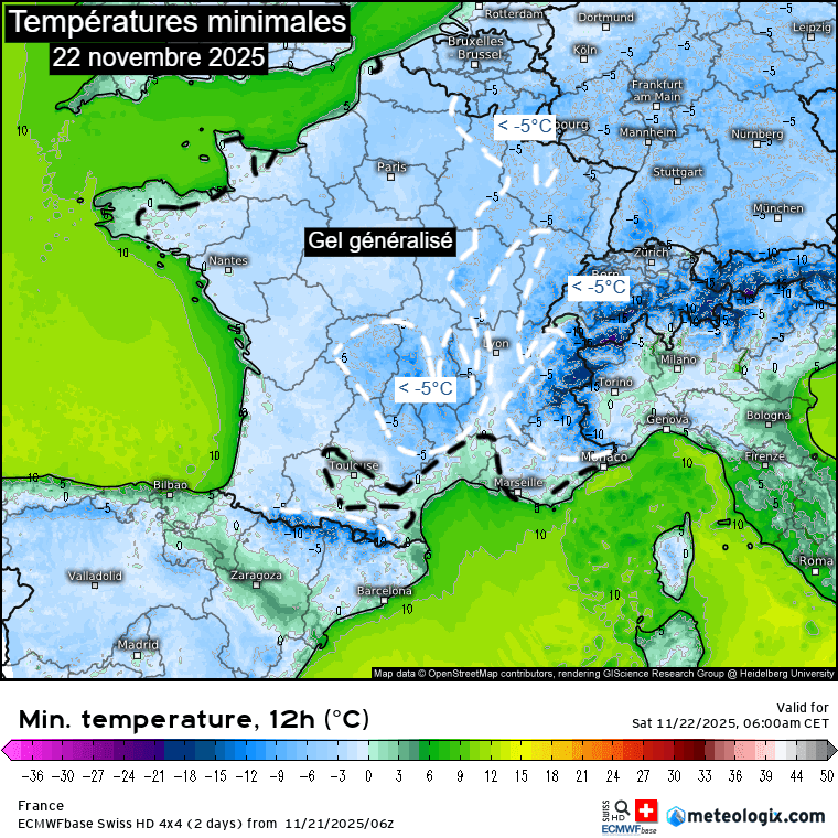 Températures minimales attendues sur la France le samedi 22 novembre 2025 – Via meteologix