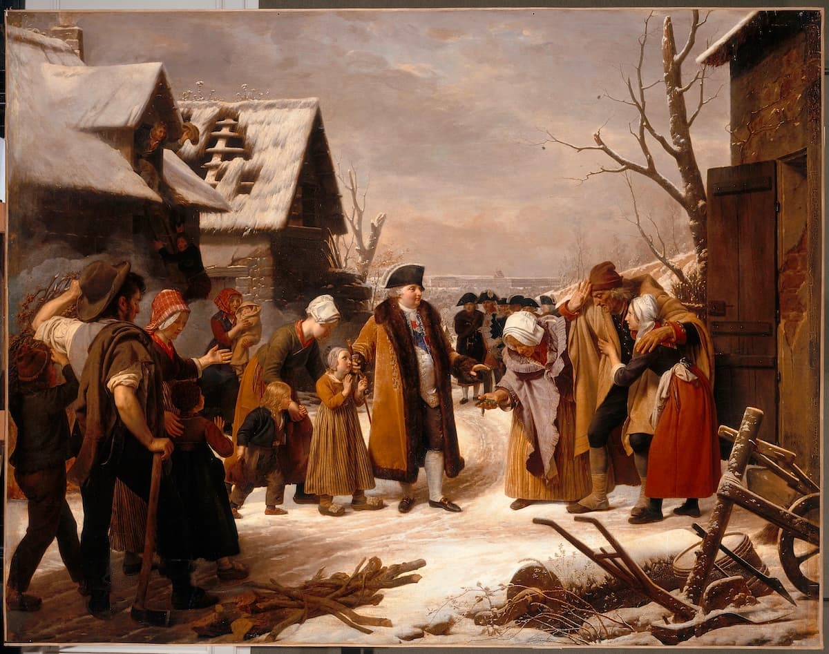 Louis XVI distribuant des aumônes aux pauvres de Versailles pendant l’hiver de 1788-1789, par Louis Hersent