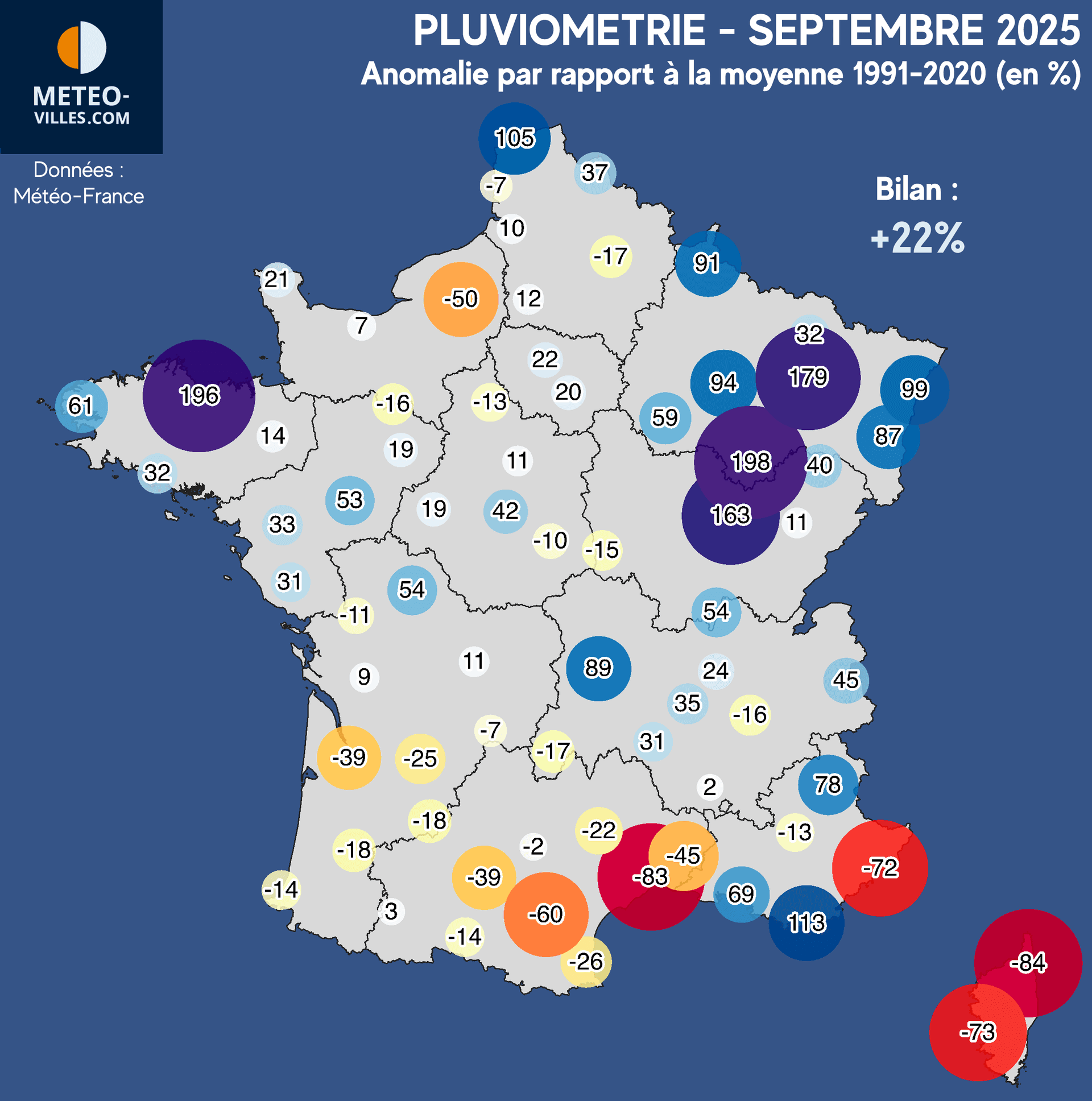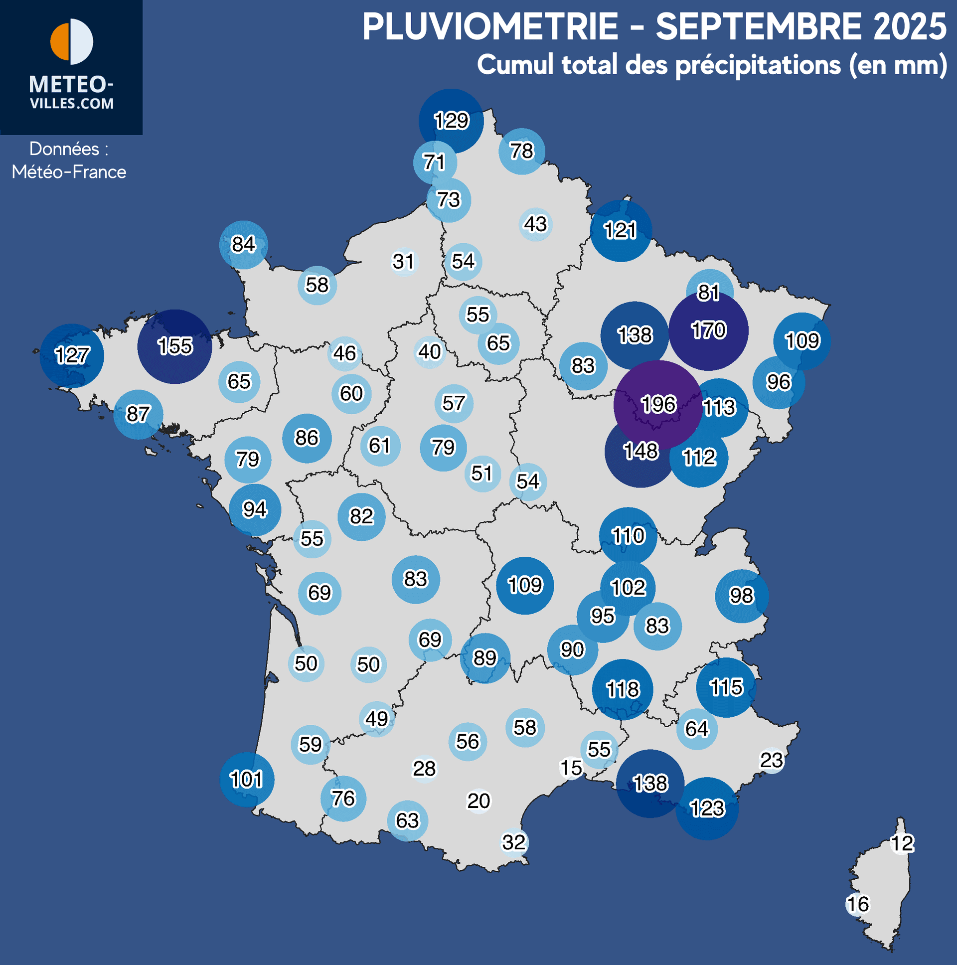 Toutes les zones les plus arrosées ont récolté en règle général plus de 100mm au cours du mois. En dehors du nord de la Bretagne et sur le Pas-de-Calais, c'est toute la moitié Est de la France qui a vu le plus de précipitations durant le mois. Entre Bourgogne-Franche-Comté et Grand-Est, le cumul atteint même 170mm pour Nancy record pour septembre) et 196mm pour Langres, et dépasse les 200mm sur une poignée de stations du réseau secondaire. Le maximum est pour une station d'altitude avec 310mm au Ballon-de-Servance (Haute-Saône). A noter qu'en Alsace et en Lorraine, il s'agit du mois de septembre le plus humide depuis plus de 40 ans (1984).