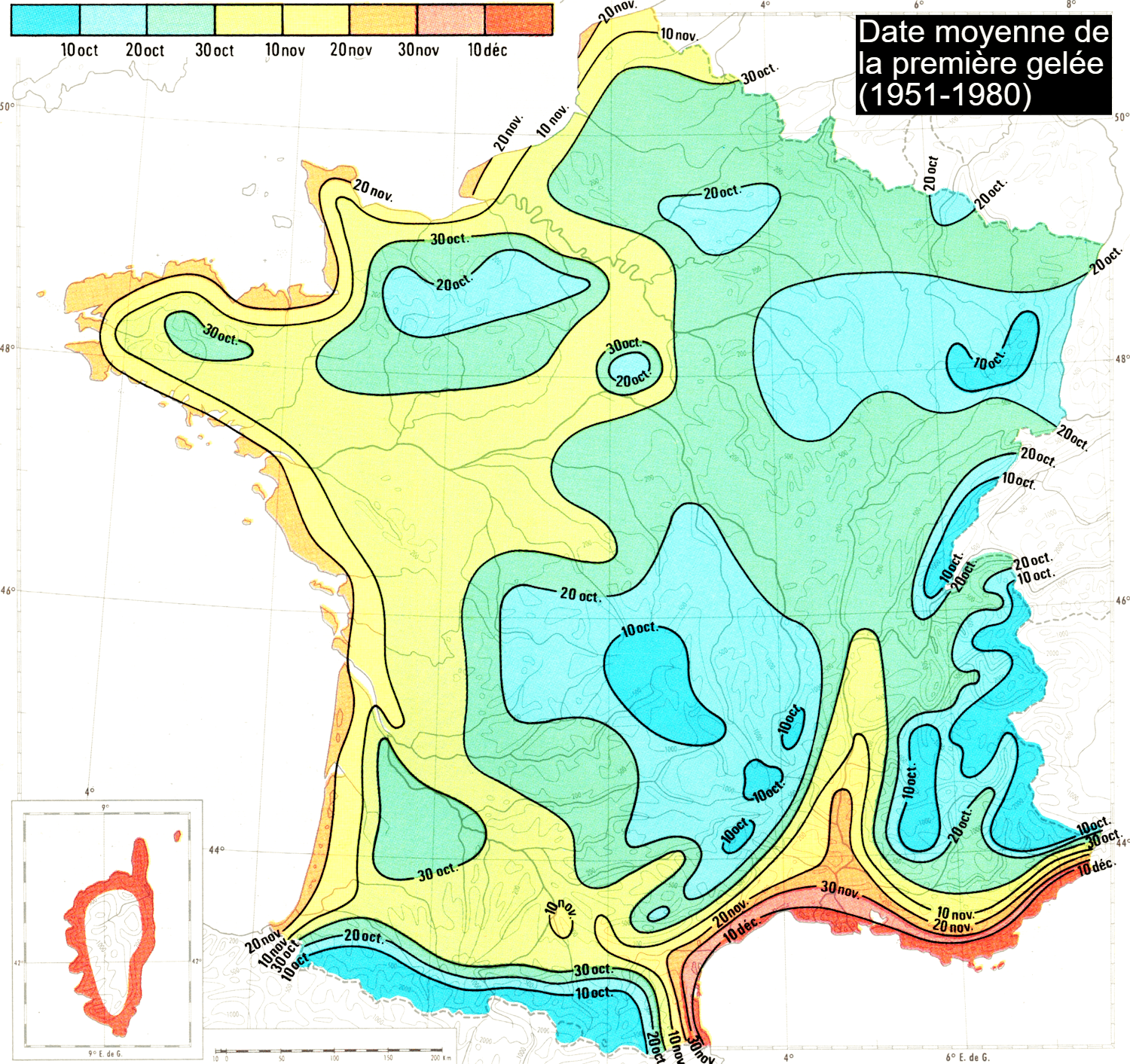 Date moyenne des premières gelées en France sur la base 1951-1980 - Météo Villes