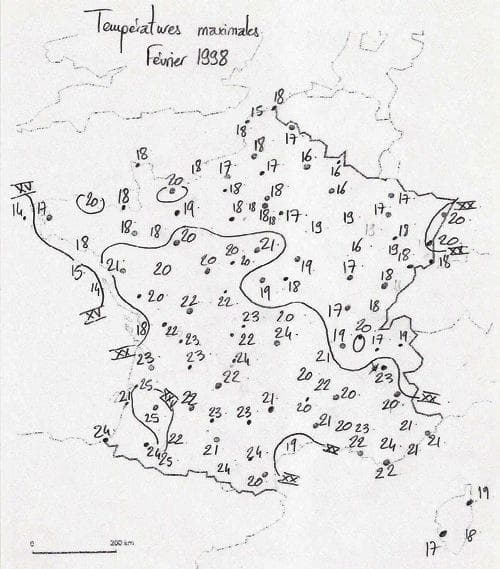La référence en terme d’épisode de douceur exceptionnelle reste néanmoins la fin du mois de février 1960. Sous un puissant flux de Sud/Sud-Ouest, une masse d’air tropicale est directement advectée vers la France, provoquant une envolée remarquable des températures sur une large partie du pays.