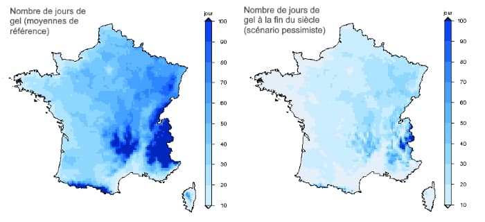 Outre les nombreuses périodes de douceur, le nombre de jours de gel par an pourrait être divisé par 3 entre le début et la fin du XXIème siècle ! Le gel deviendrait alors un phénomène rare sur les régions côtières de la Manche de l'Atlantique et véritablement atypique aux abords de la Méditerranée. Cela pourrait avoir des conséquences notables sur la faune et la flore, qui ont besoin de se mettre en sommeil à la saison hivernale. Ces problèmes sont déjà observés de nos jours, par exemple au travers des floraisons trop précoces devenant très vulnérables au gel tardif...