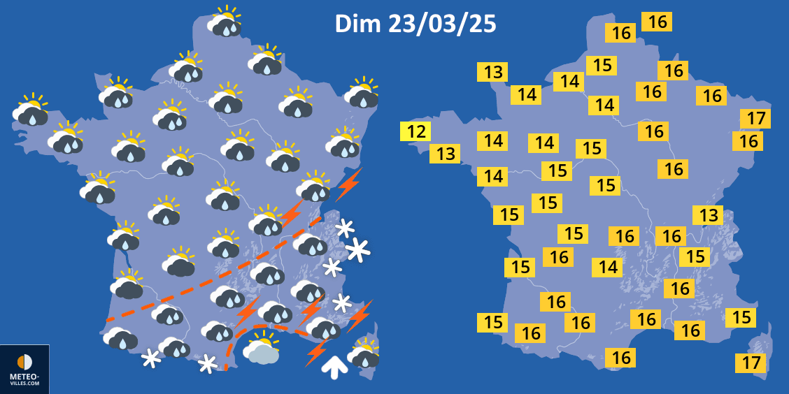 La journée du dimanche 23 mars 2025 restera placée sous le signe de l'instabilité. Les précipitations les plus fréquentes circuleront des Pyrénées aux Alpes et jusqu'à la côte d'Azur, prenant parfois un caractère orageux. Sur le reste du territoire, le ciel sera majoritairement nébuleux avec un risque d'averses. Les températures vont quelque peu fléchir, bien qu'une certaine douceur restera présente. Il fera entre 14 et 16°C sur la majeure partie des régions en après-midi.
