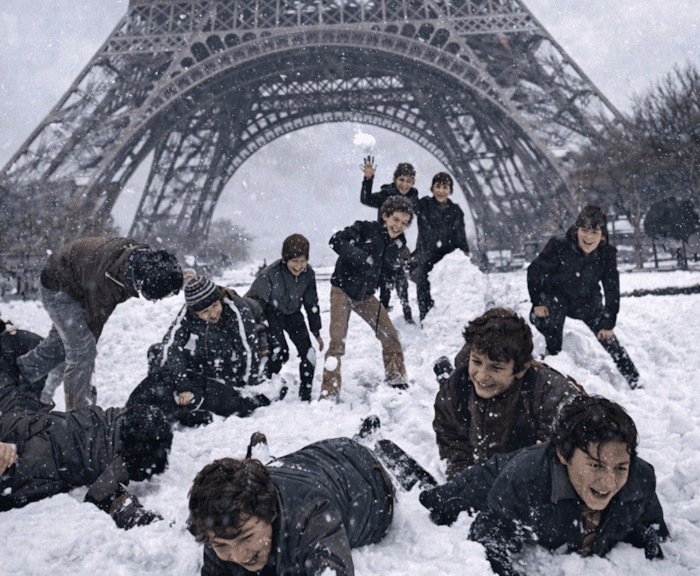 Enfants jouant dans la neige sous la Tour Eiffel à Paris le 19 mars 1975 - Chronique Météo Villes