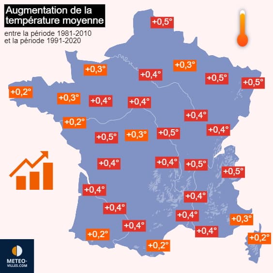 La carte ci-dessous montre l'augmentation de la température annuelle moyenne dans différentes villes françaises entre la période 1981-2010 et la période 1991-2020. Lille, Nevers, Poitiers, Nancy, Strasbourg & Lyon figurent parmi les hausses les plus importantes avec +0,5°C lors de cette mise à jour décennale des normales climatiques. Les plus faibles augmentations sont constatées à Brest, Nantes, Pau, Perpignan et Bastia avec +0,2°C.