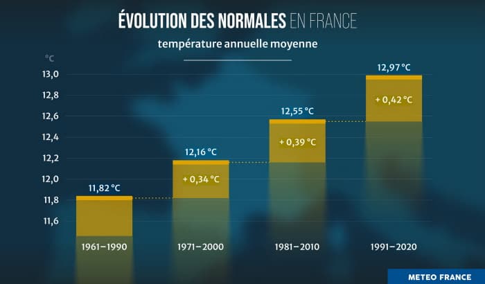 Ainsi, les nouvelles normales climatiques sur la période 1991-2020 donnent une température moyenne à l'année de 12,97°C en France, contre 12,55°C lors de la période 1981-2010. Cela correspond à 0,42°C supplémentaire par rapport à la dernière mise à jour il y a 10 ans, la plus forte hausse jamais observée. Comme nous l'avons vu plus haut, cette hausse record est particulièrement due à la décennie 2011-2020, marquée par une hausse inédite du thermomètre en France.