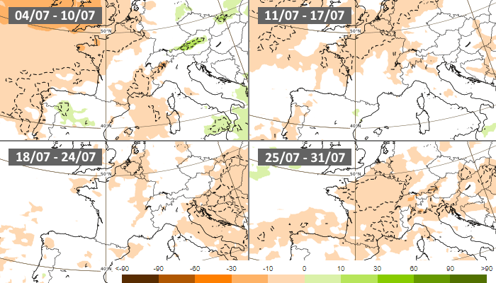 Selon les projections à long terme, cette tendance sèche pourrait bien s'inscrire dans la durée au cours du mois de juillet 2022, comme l'envisage le modèle européen ci-dessous. Si tel était le cas, la sécheresse pourrait rapidement s'accentuer de nouveau, alors qu'elle reste à des niveaux marqués dans certaines régions.