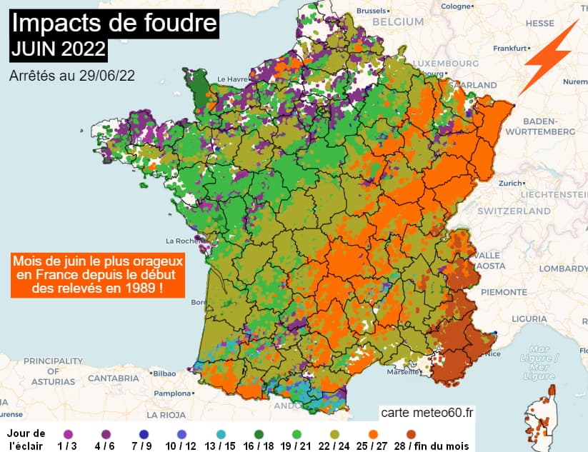 Carte des impacts de foudre en France du 1er au 29 juin 2022 - carte meteo60.fr