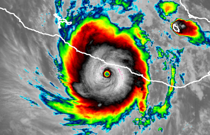 Il suffit de regarder l'image satellite ci-dessous pour comprendre l'intensité du phénomène qui a frappé le sud du Mexique au cours des dernières heures. En pleine nuit du mardi 24 au mercredi 25 octobre 2023, l'ouragan Otis a atterri sur les côte mexicaines en tant qu'ouragan majeur de catégorie 5 (sur une échelle de 5) ! Le phénomène a eu la très mauvaise idée de frapper de plein fouet Acapulco, métropole côtière d'un million d'habitants, avec des vitesses de vent moyen dépassant les 250 km/h ! Jamais cette région n'avait été frappée par un système tropical aussi puissant.