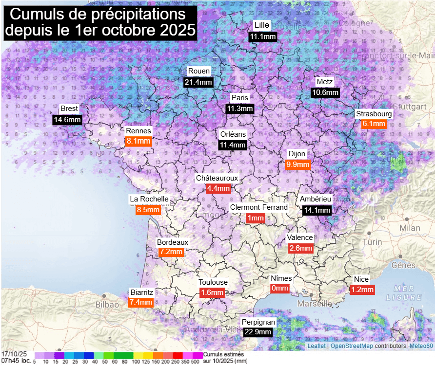 Cumuls de précipitations depuis le début du mois d'octobre sur la France – Via meteo60.fr