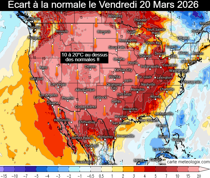 La carte ci-dessous permet de mieux prendre la mesure de l'ampleur spectaculaire de cette vague de chaleur. Le vendredi 20 mars 2026, près des 3/4 des États-Unis enregistreront des températures 10 à 20°C supérieures aux normales saisonnières ! L'anomalie est aussi remarquable pour son intensité que pour son étendue ! Plus concrètement, on atteindra les 30°C dans des régions où la normale n'est que de 12°C à cette saison et il fera plus de 40°C dans des zones où les températures de saison se situent autour de 25°C...