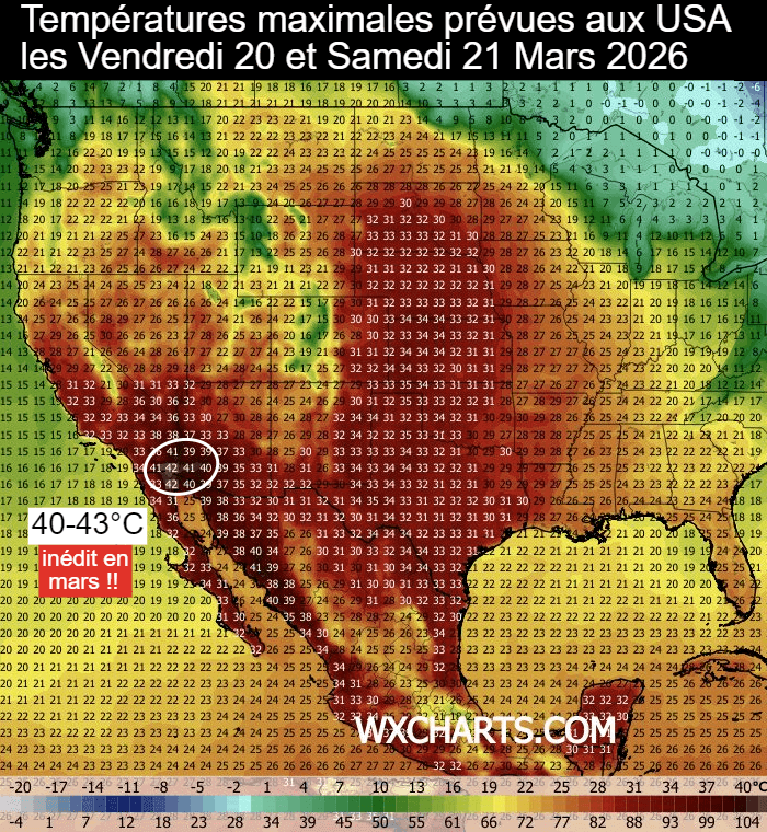 Ainsi, la chaleur va s'intensifier toute la semaine, d'abord dans le sud-ouest des USA avant de s'étendre vers le centre et le nord du pays. D'ici la fin de semaine, une grande partie des États-Unis sera exposée à des températures records ! Les journées les plus chaudes seront celles des vendredi 20 et samedi 21 mars 2026. On prévoit plus de 40°C dans le sud-ouest du pays avec des pointes autour de 43°C entre le sud de la Californie et l'Arizona, une température encore jamais mesurée aux USA au cours d'un mois de mars ! On prévoit 30 à 33°C jusque dans le Dakota du Sud, à une latitude semblable à Lyon !