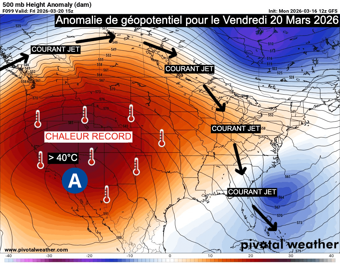 Anomalie de géopotentiel montrant le dôme de chaleur sur les USA le vendredi 20 mars 2026 - pivotal weather