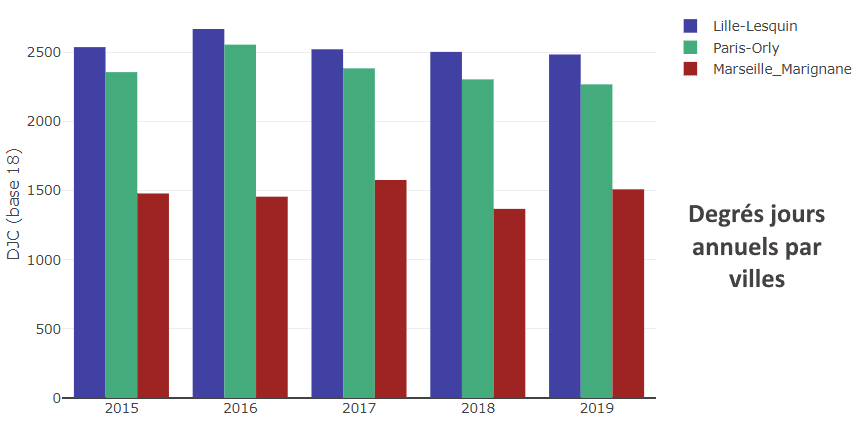 Degrés jours annuels à Lille-Lesquin, Paris-Orly et Marseille-Marignane entre 2015 et 2019 - via openergy.fr