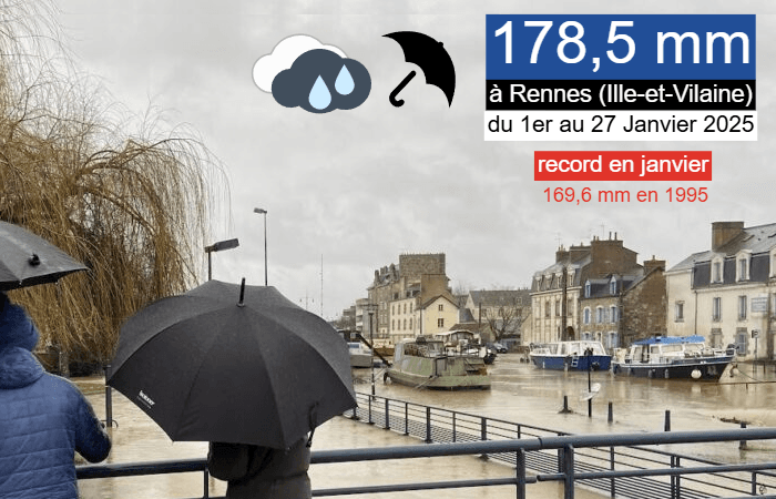 Ces inondations majeures sont notamment causées par une pluviométrie qui s'avère remarquable dans l'est de la Bretagne en ce premier mois de l'année 2025. En effet, la station de Rennes est en train de vivre son mois de janvier le plus arrosé depuis le début des mesures. Au lundi 27 janvier 2025, il était déjà tombé un total de 178,5 mm de pluie sur la capitale bretonne, battant l'ancien record de 169,6 mm établi en janvier 1995 !