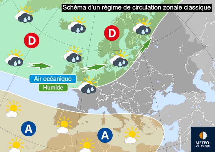 Il existe différents régimes qui régissent le temps en Europe. Parmi eux, c'est le régime de circulation zonale qui s'avère statistiquement le plus fréquent. Il est défini par des dépressions circulant sur le nord de l'Atlantique, la Mer du Nord et la Scandinavie et un anticyclone entre les Açores et la Méditerranée, entraînant un flux d'ouest sur de vastes régions européennes, dont la France. C'est ce régime qui vaut à notre pays son climat océanique tempéré.