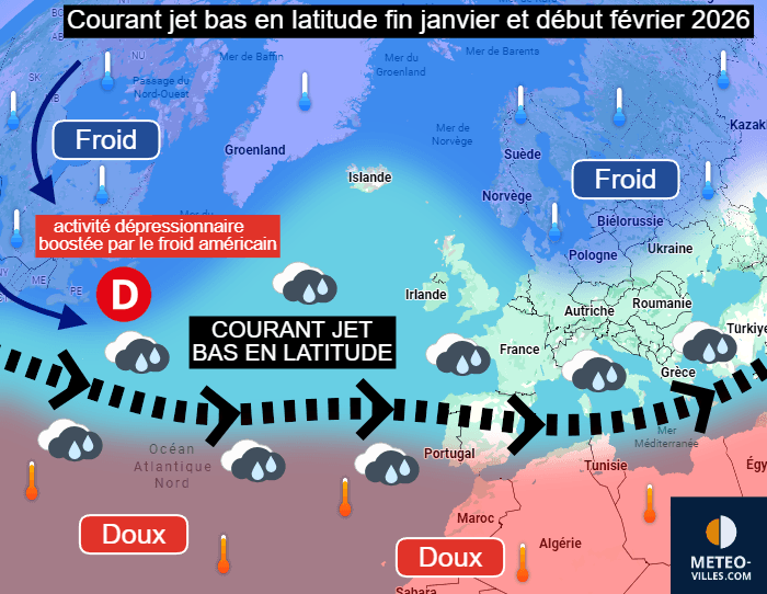 Schéma montrant la circulation basse en latitude du courant jet fin janvier et début février 2026 - Météo Villes