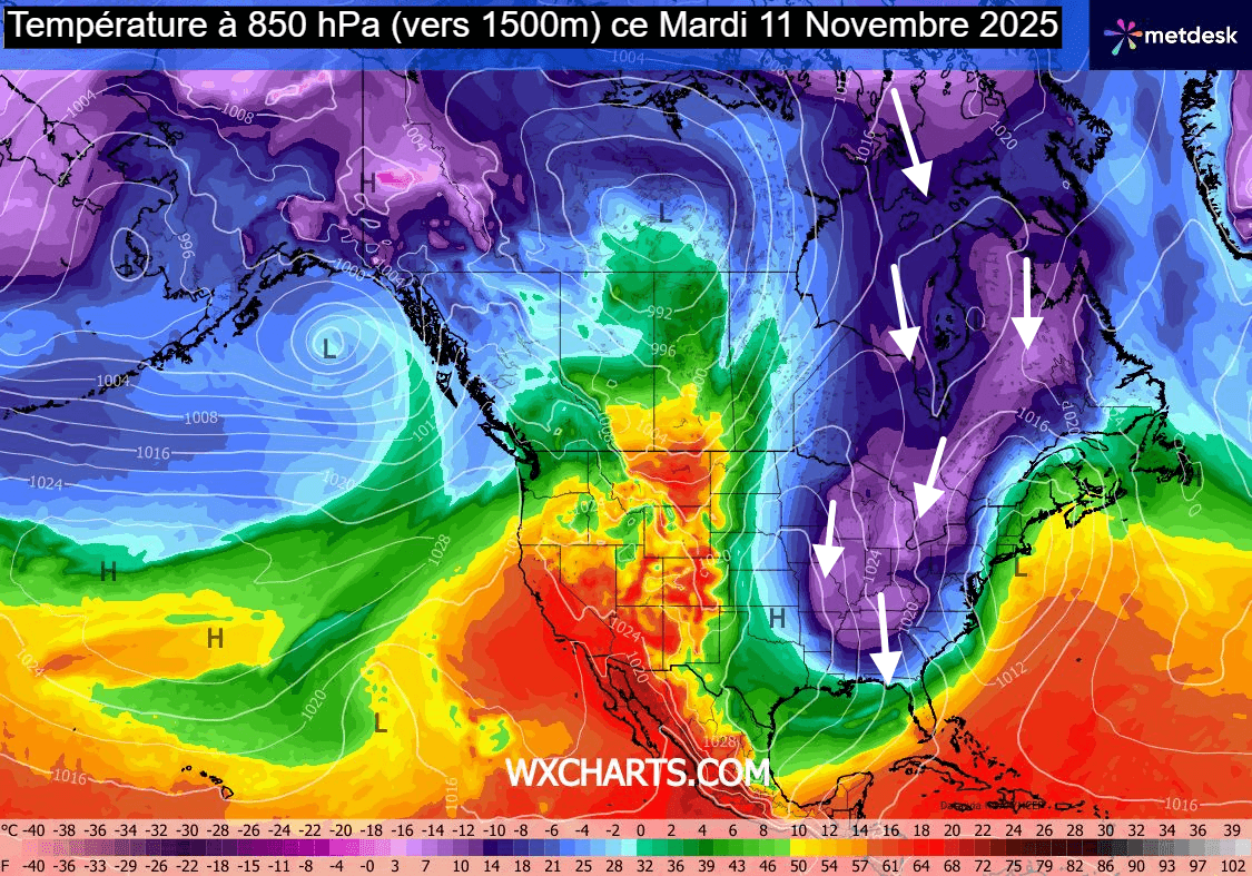 Température à 850 hPa (vers 1500m) en Amérique du Nord ce mardi 11 novembre 2025 - wxcharts.com