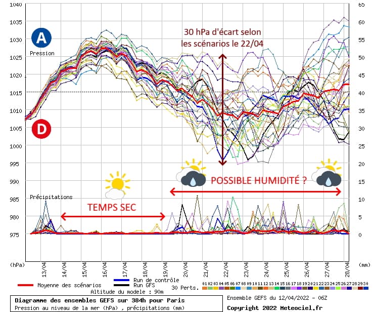Si l'on prolonge le graphique jusqu'à la fin du mois d'avril 2022, on constate qu'après le pic de hautes pressions aux alentours de Pâques, la moyenne des scénarios voit les pressions reculer assez nettement au cours de la semaine prochaine (du 18 au 24 avril). Cependant, on constate également que les scénarios divergent très fortement avec des écarts de 30 hPa entre les scénarios dès le début de la troisième décade du mois d'avril ! Cette dispersion des courbes témoigne des grandes incertitudes sur l'évolution du temps en France après Pâques...