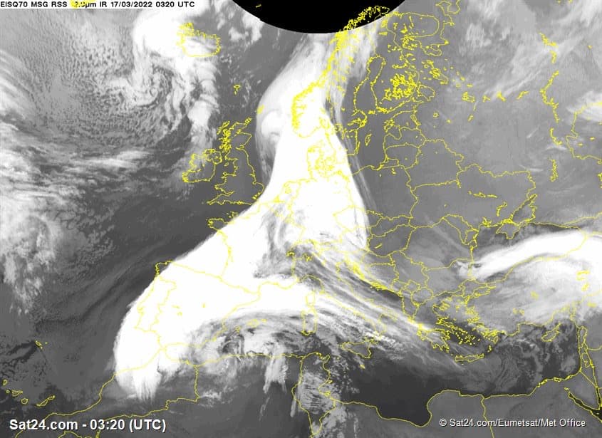 Nuage de sable d'une dimension exceptionnelle sur l'Europe de l'Ouest le 17 mars 2022 - Sat24