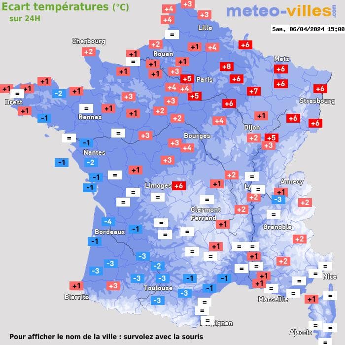 Evolution des températures en 24h entre le Vendredi 05 et le Samedi 06 avril 2024 à 15h loc. - MeteoVilles