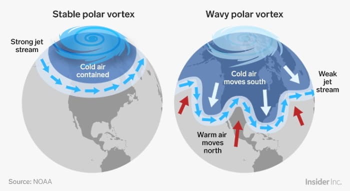 Si un jet stream ondulant durant l'hiver ne garantit absolument pas une vague de froid, il ouvre cependant la possibilité aux masses d'air froid d'atteindre des régions qui ne pourraient pas l'être en cas de jet stream fort et linéaire (qui correspondrait à un flux océanique vecteur d'air doux et humide en France).