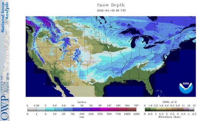 Couche de neige au sol sur les États-Unis le 26 janvier 2026 - NOAA