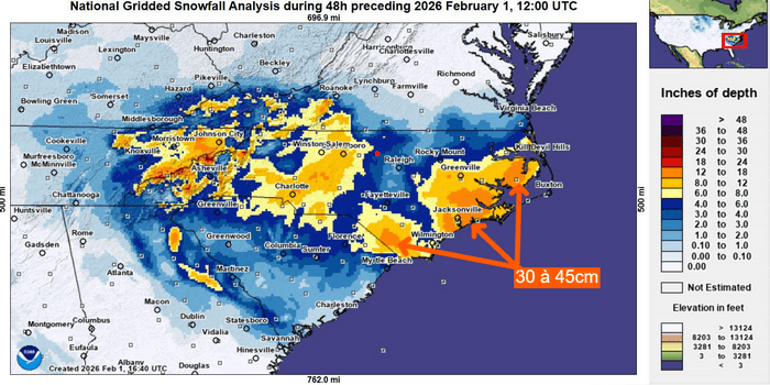 C'est en Caroline du Nord que les cumuls de neige les plus importants ont été observés durant le week-end avec parfois plus de 30-40cm sur certains secteurs et ce jusqu'aux littoraux, le tout sous de très fortes rafales de vent donnant un véritable blizzard sur des régions peu habituées aux chutes de neige.