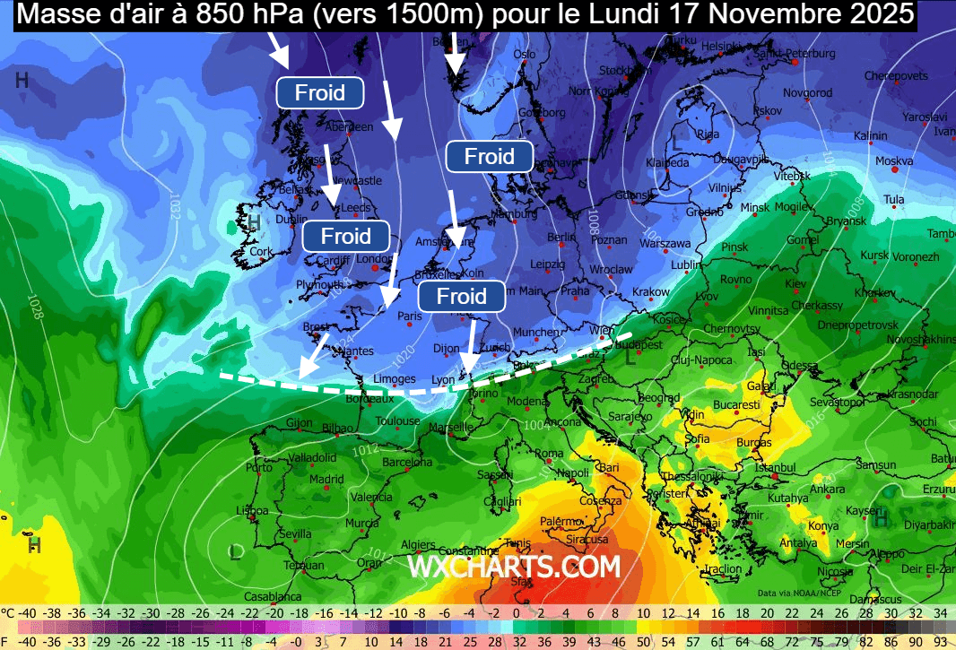 Masse d'air à 850 hPa (vers 1500m) pour le lundi 17 novembre 2025 - wxcharts.com