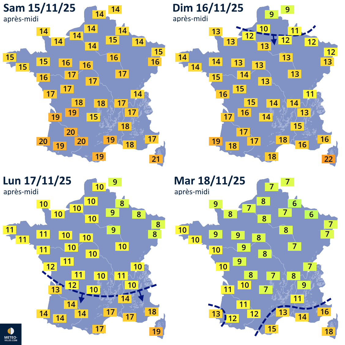 Températures maximales prévues du samedi 15 au mardi 18 novembre 2025 - Météo Villes