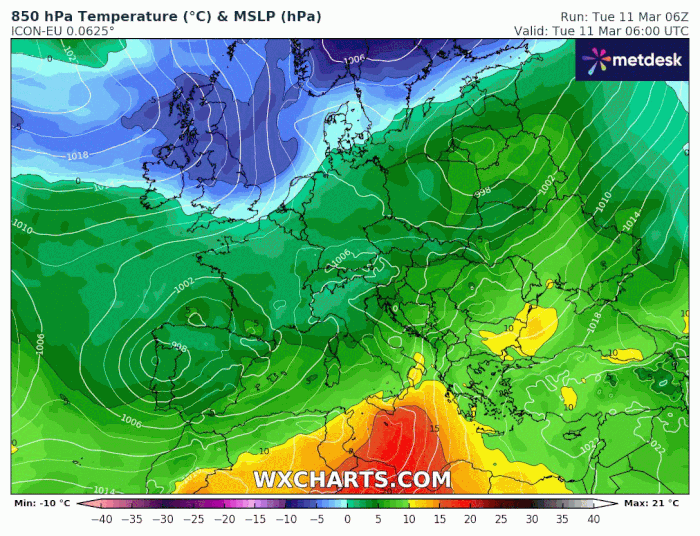 Masse d'air à 850 hPa (vers 1500m) du mardi 11 au samedi 15 mars 2025 - wxcharts.com