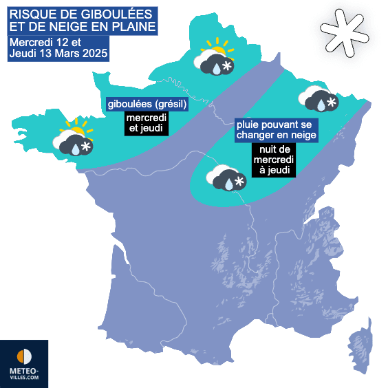 Les mercredi 12 et jeudi 13 mars 2025, des averses se déclencheront de la Bretagne au Nord. Avec l'air froid en altitude, elles pourront prendre la forme de giboulées avec du grésil ou de la neige roulée. Par ailleurs, un front va remonter du centre vers le nord-est de la France dans la nuit de mercredi à jeudi. Par effet d'isothermie, plusieurs scénarios envisagent la possibilité de voir la pluie se changer en neige fondante entre la Bourgogne et la Lorraine. Une tenue locale n'est pas exclue sur les points hauts (notamment les plateaux lorrains).