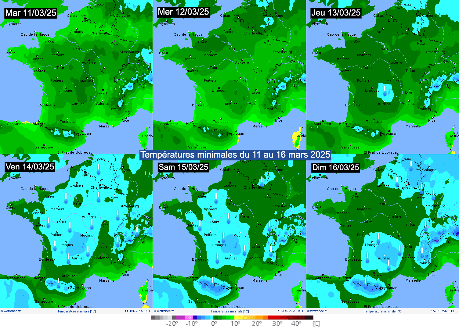 Températures minimales prévues du mardi 11 au dimanche 16 mars 2025 - wofrance.fr
