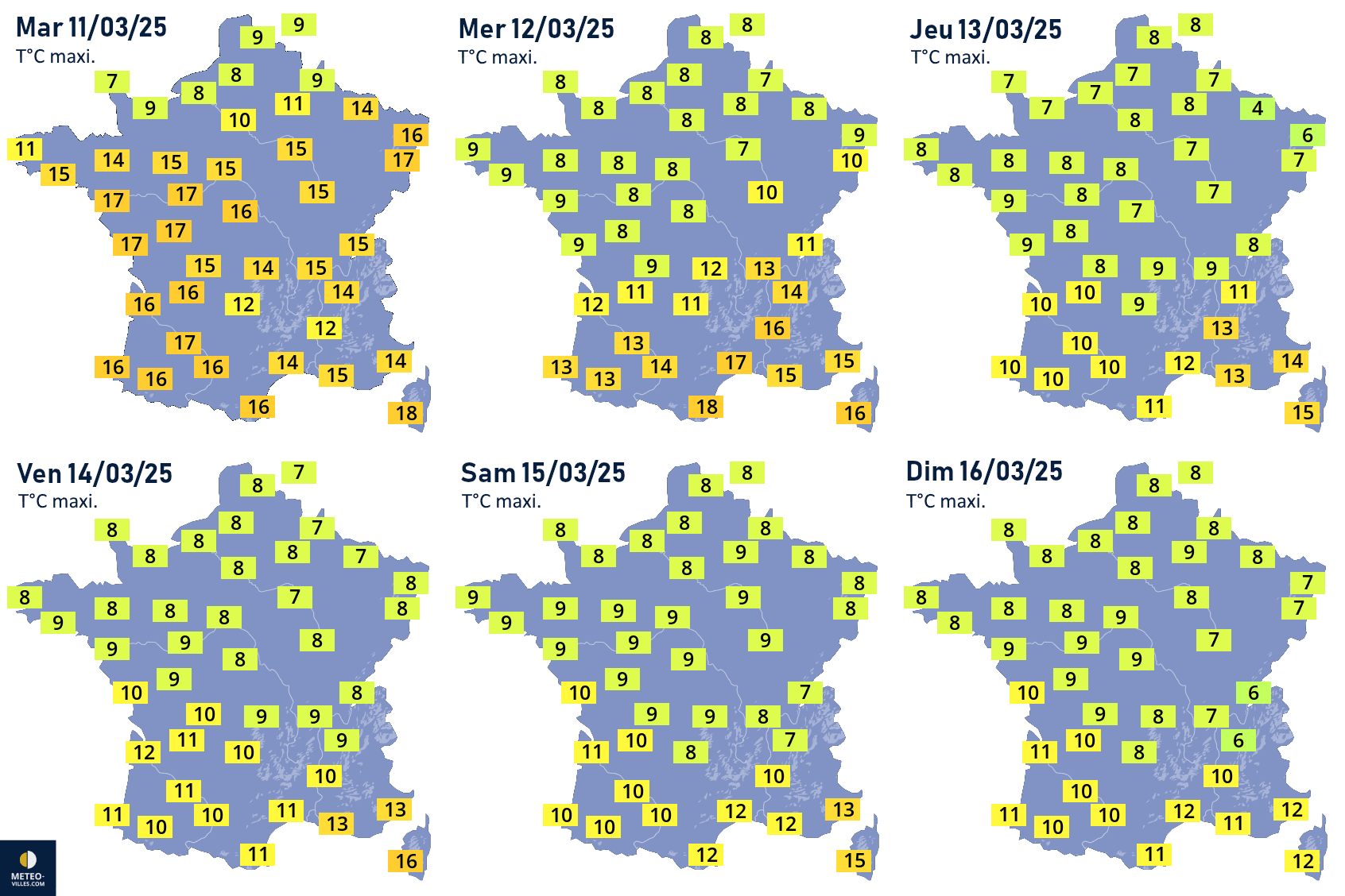 Températures maximales prévues du mardi 11 au dimanche 16 mars 2025 - Météo Villes