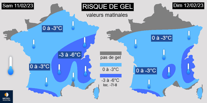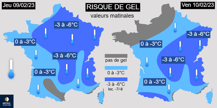 Le risque de gel s'étendra à la plupart des régions françaises à compter de la matinée du mardi 7 février 2023. En règle générale, les gelées resteront faibles avec 0 à -3°C pour les valeurs les plus basses. Les régions méditerranéennes ne seront pas concernées. Ce risque s'affirmera en matinée du mercredi 8 février avec 0 à -3°C en moyenne dans le sud et l'ouest du territoire mais régulièrement -3 à -6°C du Massif Central aux frontières du nord et de l'est. Notons que le gel s'observera jusque dans certains départements méditerranéens.