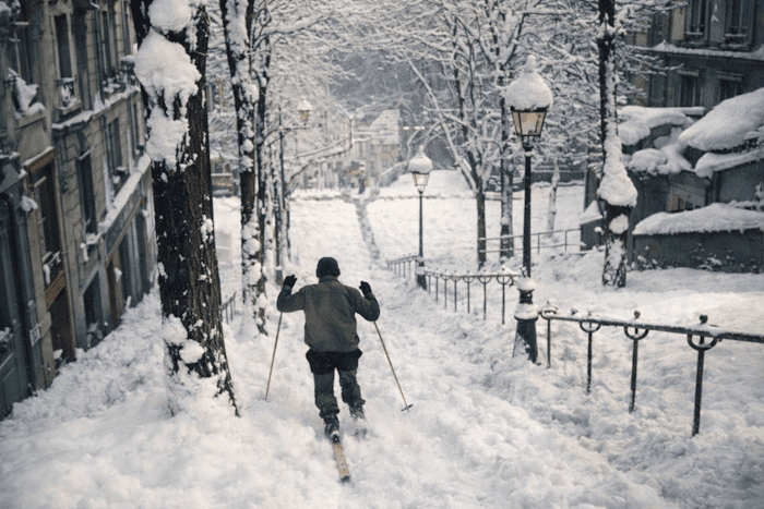 Skieur descendant la butte Montmartre à Paris début mars 1946Chronique Météo Villes
