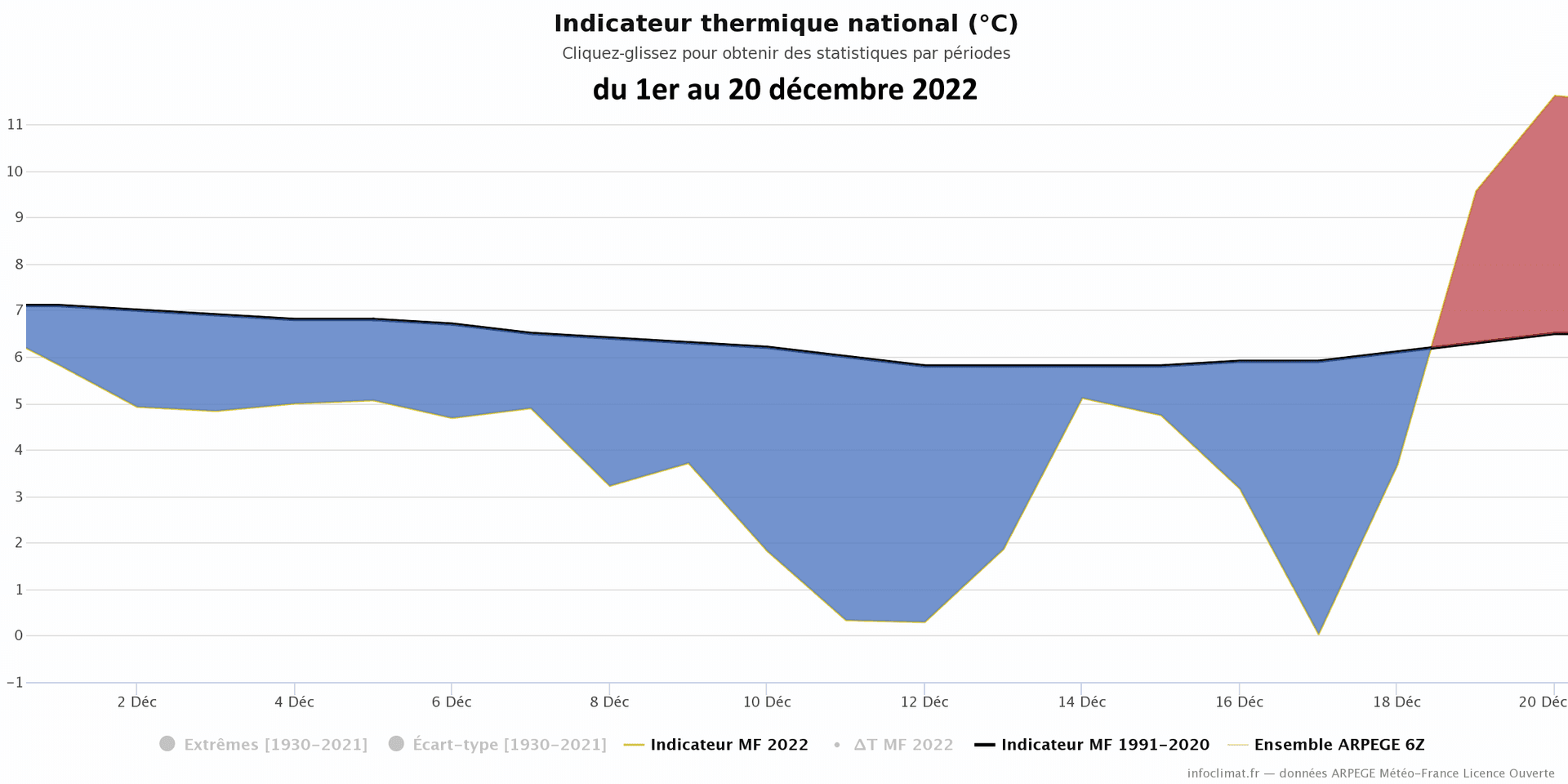 Anomalie thermique en France du 1er au 20 décembre 2022 – graphique infoclimat.fr