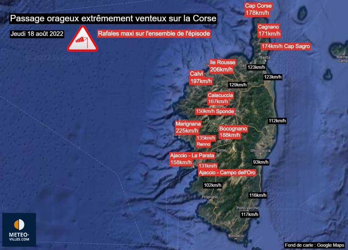 En matinée du jeudi 18 août, la Corse est frappée par ce qui fut probablement le phénomène météorologique le plus marquant de l'année 2022 en France ! L'île de beauté fut balayée par un système orageux en arc, frappant notamment le nord et l'ouest de l'île où les rafales ont atteint des valeurs tout simplement remarquables de 150 à 200 km/h ! On mesure même jusqu'à 206 km/h à l'Île-Rousse et 225 km/h à Marignana, battant des records absolus !