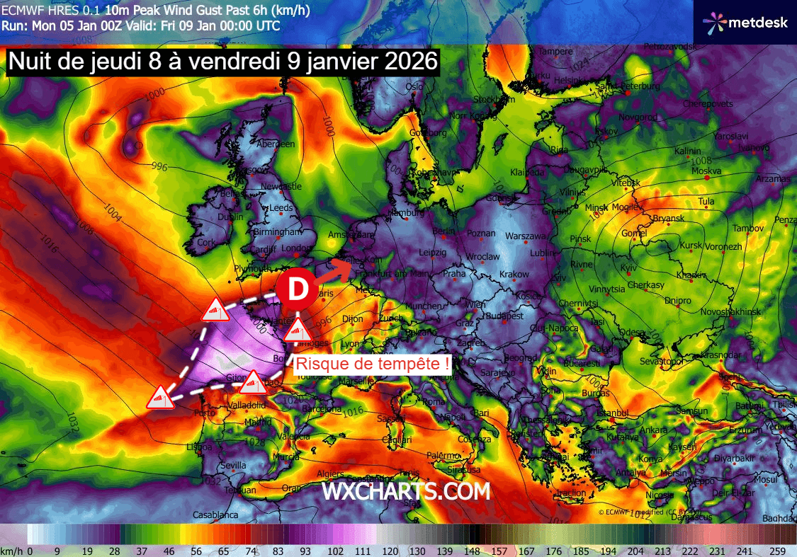 Risque de tempête sur la France pour la nuit du jeudi 8 au vendredi 9 janvier 2026 – Modèle GFS via WX CHARTS