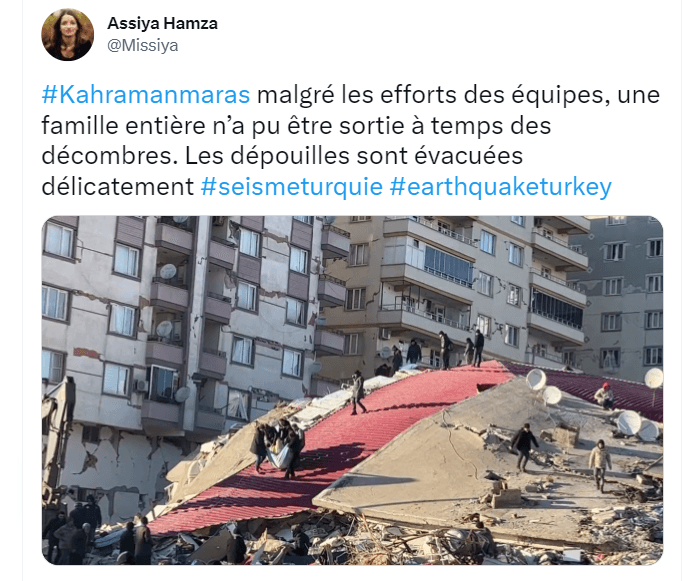 Évacuation des victimes du séisme à Kahramanmaras (Turquie) le 7 février 2023 - via Assiya Hamza