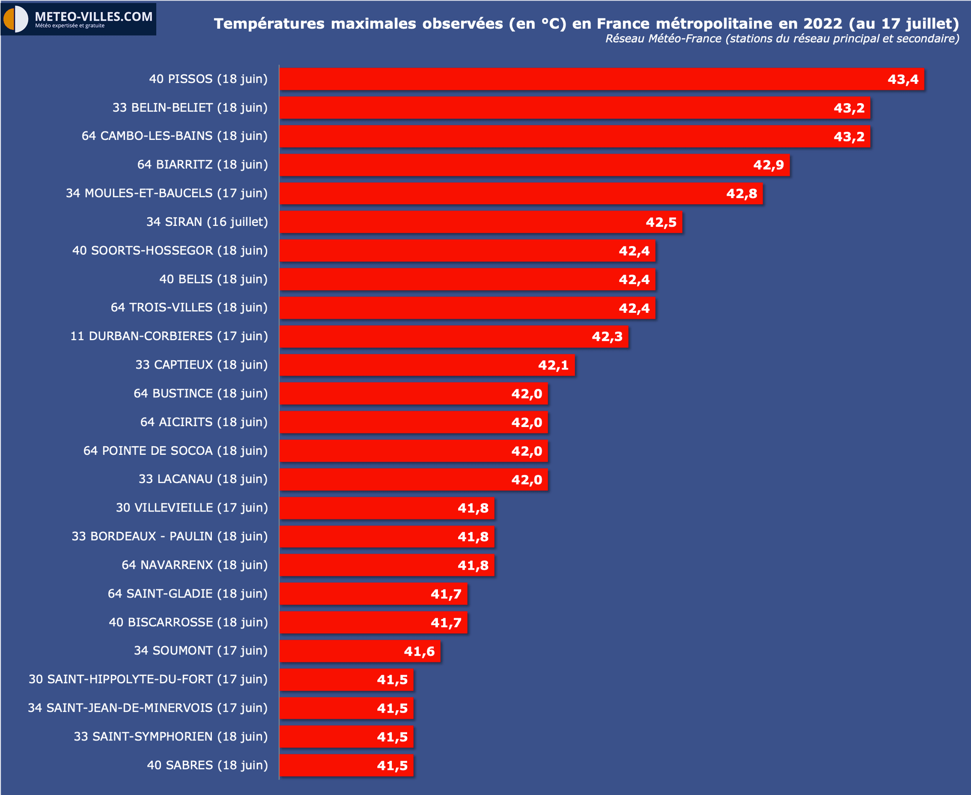 Températures maximales observées - dimanche 17 juillet 2022 - Météo-Villes