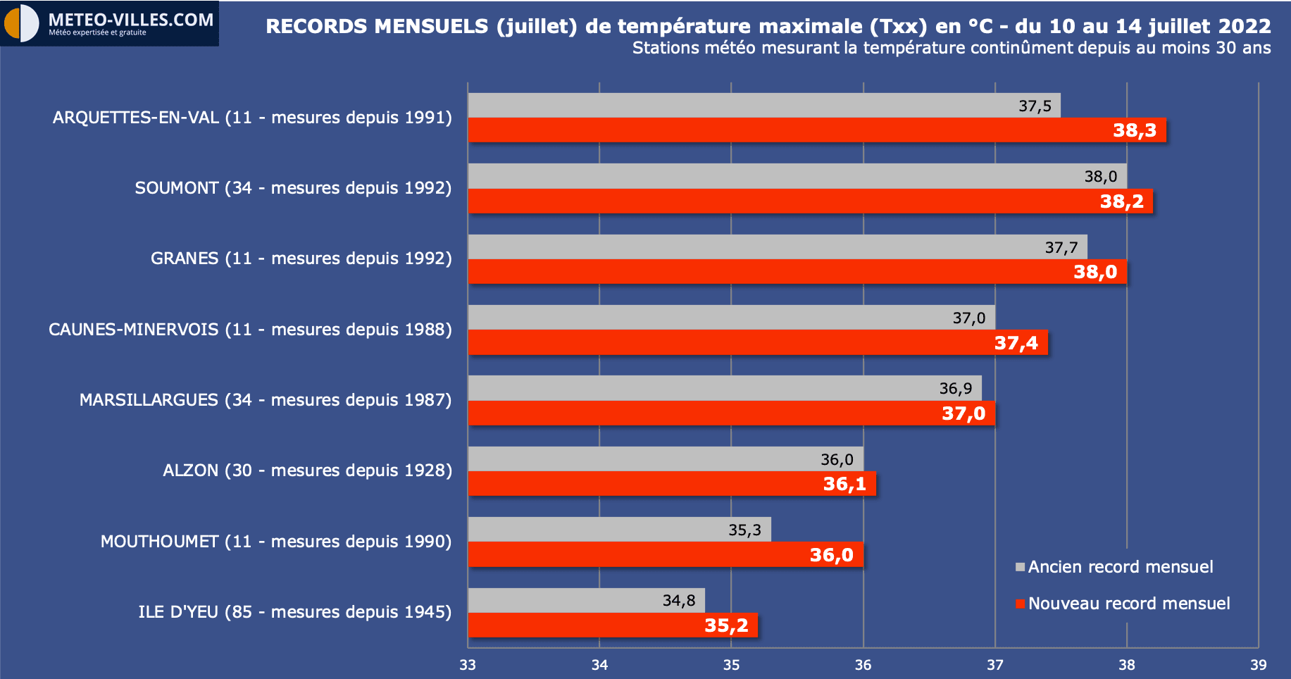 Face à de telles températures, ce sont de nouveaux records pour un mois de juillet qui ont été battus durant l'après-midi. Pour certaines villes de l'Hérault ou de l'Aude, l'ancien record mensuel a été battu pour la 2e fois voire même la 3e fois en quelques jours (Soumont, Arquettes-en-Val, Caunes-Minervois...).