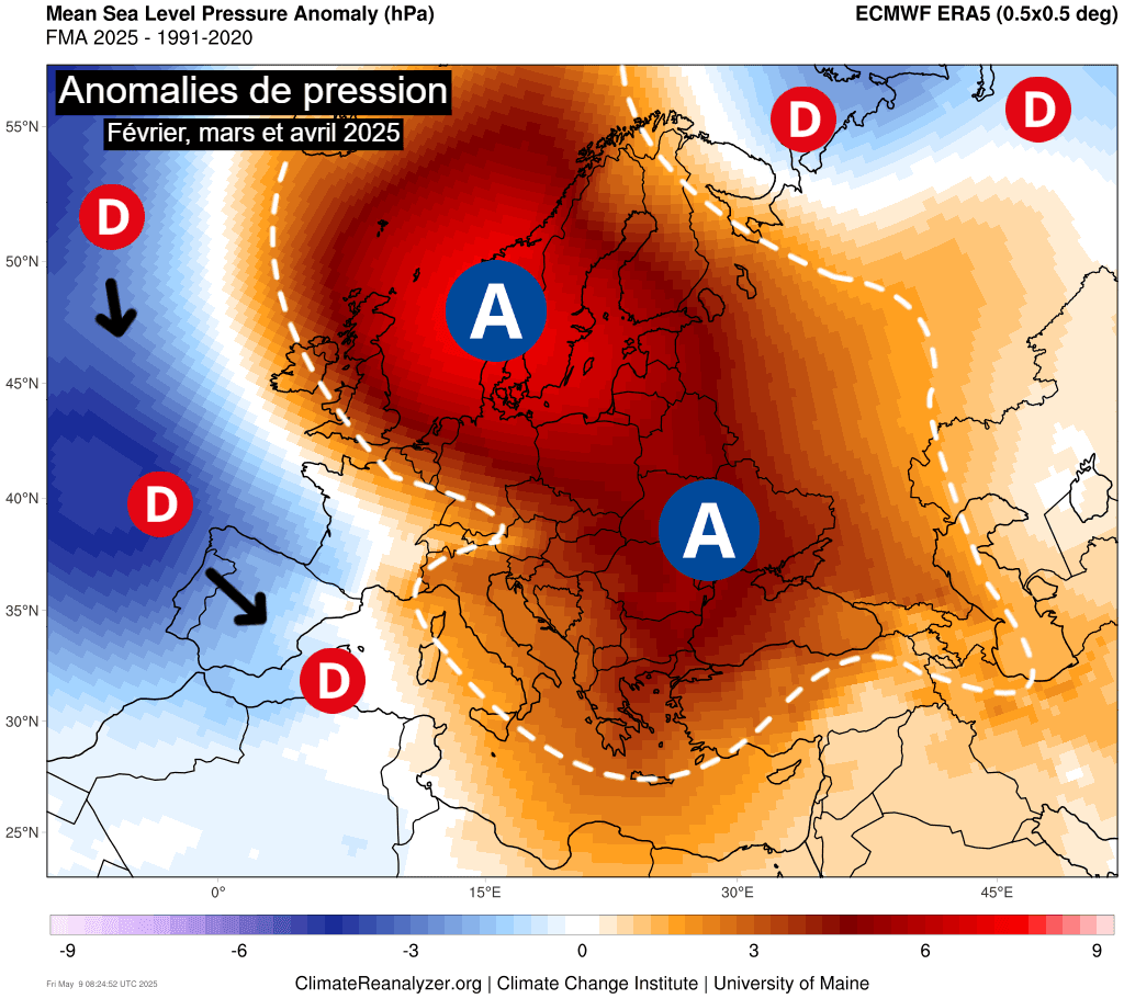 Anomalies de pression en Europe entre février, mars et avril 2025 – ClimateReanalyzer