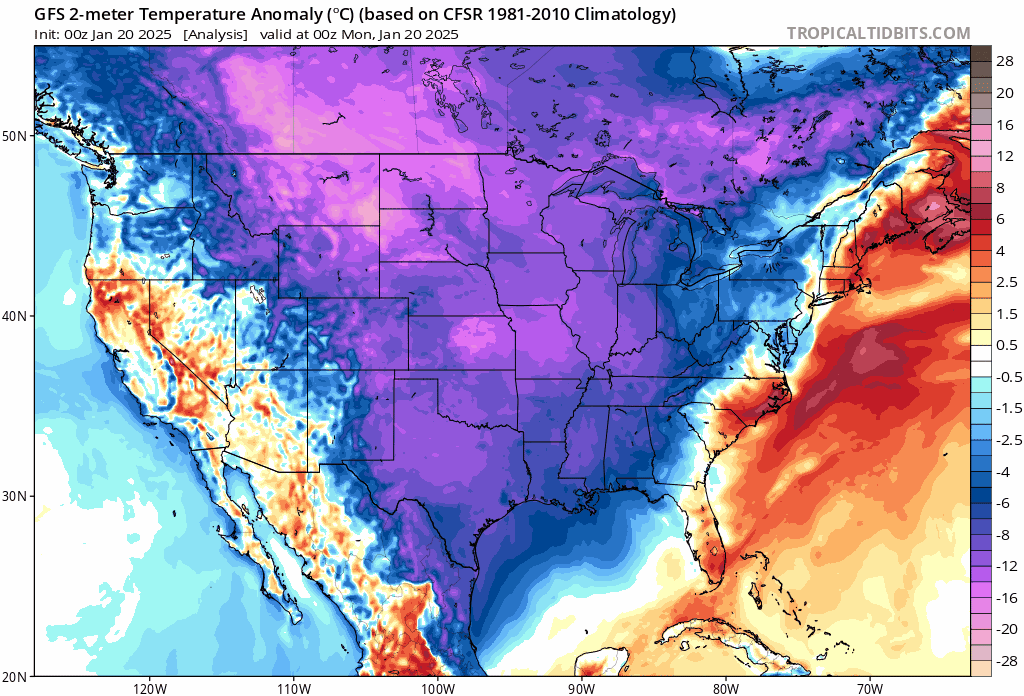 Anomalies de températures à 2m sur les États-Unis entre le 20 et le 25 janvier 2025 – Via TropicalTidBits